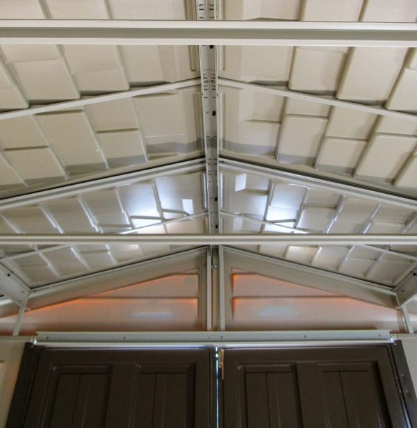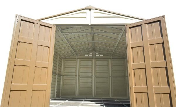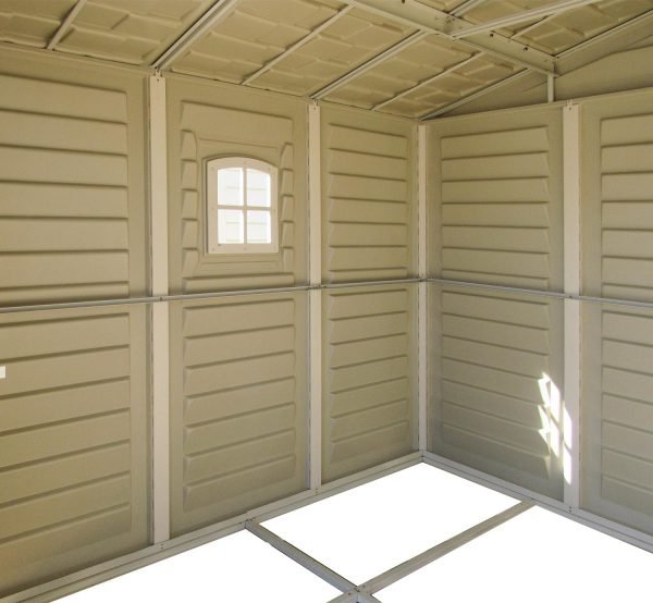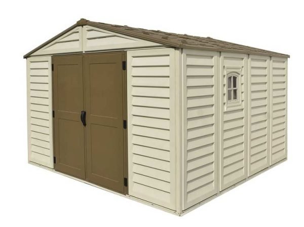 Our DURAMAX 10.5 x 10.5 foot WOODBRIDGE PLUS shed features wall columns that are reinforced with solid metal allowing you to easily hang shelves. This shed comes a complete with a solid reinforced metal floor frame that eliminates the need for building a foundation, simply add plywood to this frame or it can even be used as a form to pour concrete into. Buy DURAMAX WOODBRIDGE 10.5’x10.5′ GARDEN SHED Online in USA and Canada.