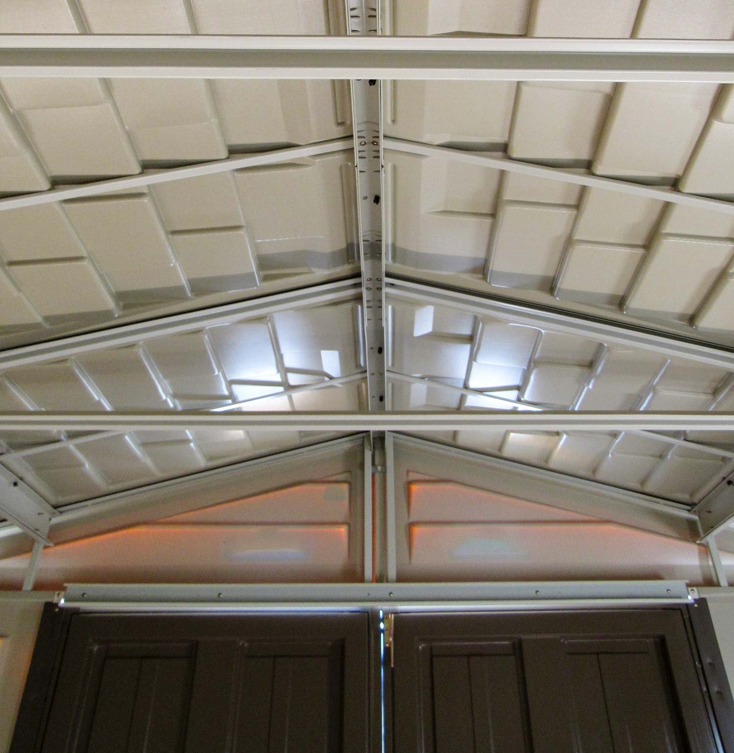 The DURAMAX 10.5 x 10.5 foot WOODBRIDGE PLUS shed features wall columns that are reinforced with solid metal allowing you to easily hang shelves. This shed comes a complete with a solid reinforced metal floor frame that eliminates the need for building a foundation, simply add plywood to this frame or it can even be used as a form to pour concrete into.