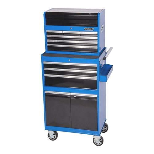 The Kincrome 9 drawer chest and trolley combo is a fantastic solution for any professional tradesperson or serious DIYer. With heavy duty ball bearing slides and lockable swivel castors, this unit is perfect for any workshop. To maximise storage this unit has both a deep lid and a large lower storage cabinet, along with a security locking system to ensure your tools are secure.