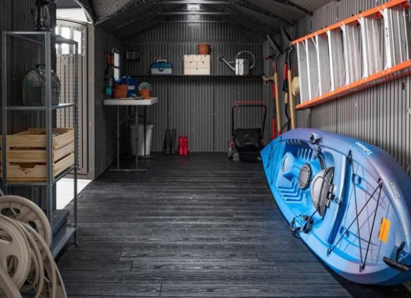 Plastic shed is designed for durability and very low maintenance.  The steeply pitched roof offers excellent storage space and quick drainage of rainwater, and features heavy-duty steel trusses for additional strength. The double doors have full-length steel hinges and are lockable. The black HDPE floor is slip resistant and resistant to oils, solvents and stains. Buy LIFETIME 20’x8′ GARDEN SHED Online