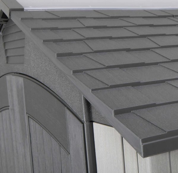 The LIFETIME 7′ x 12′ foot PLASTIC GARDEN SHED – a high quality outdoor storage shed to keep your garden equipment, tools, bikes and toys safe, dry and secure. The molded woodgrain wall panels and simulated shingle roof ensure that it is an attractive addition to your property as well as a solution to your storage needs. Constructed from UV-stabilised high-density polyethylene (HDPE) with steel reinforcing members, the LIFETIME 7′ x 12′ is designed for durability and very low maintenance.