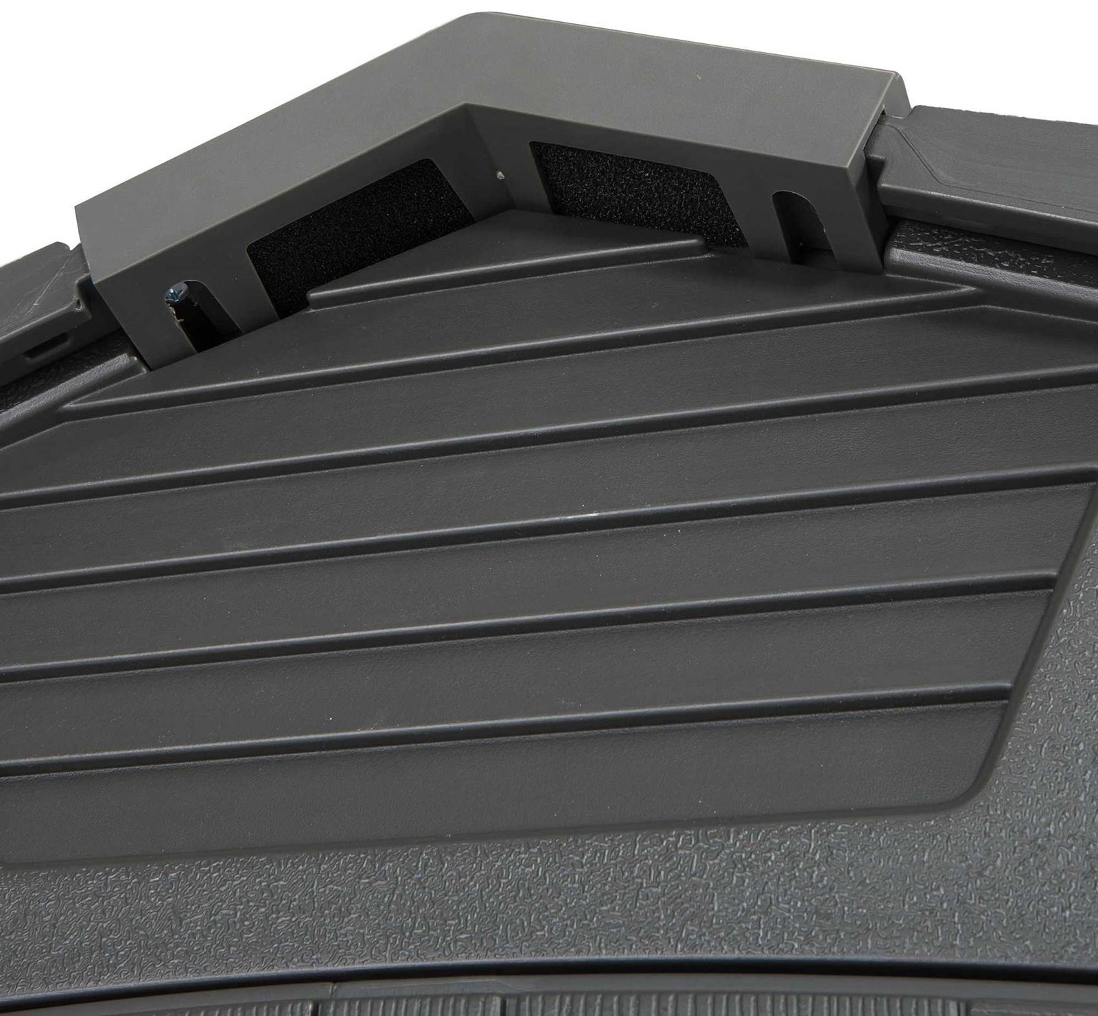 Constructed from UV-stabilised high-density polyethylene (HDPE) with steel reinforcing members, the LIFETIME 7′ x 12′ is designed for durability and very low maintenance.  The steeply pitched roof offers excellent storage space and quick drainage of rainwater, and features heavy-duty steel trusses for additional strength. The double doors have full-length steel hinges and are lockable. The black HDPE floor is slip resistant and resistant to oils, solvents and stains. The single-hinged double doors open nearly 180 degrees for ease of access and lock closed, padlock not included.