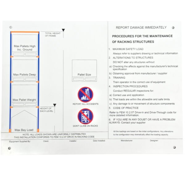 Load signs used for pallet racking, drive in racking, cable racking and cantilever racking must be fixed to the end of the frame and above 2000mm from the ground. Signs for other applications will need to be installed in a position which can be viewed by the user of the equipment.