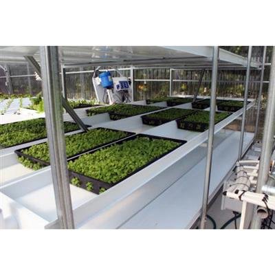 The Microgreen Rack is made from galvanized steel and has UV-stabilized food growing channels. Fully assembled, the system is 12′ 6″ L x 4′ 2″ W x 6′ 4″ H. Each channel is 10″ W x 12′ L, and with 16 channels, a full growing channel should be available for harvest 3-4 times a week.