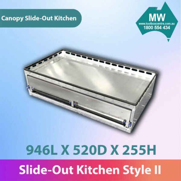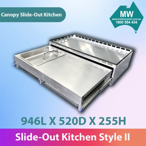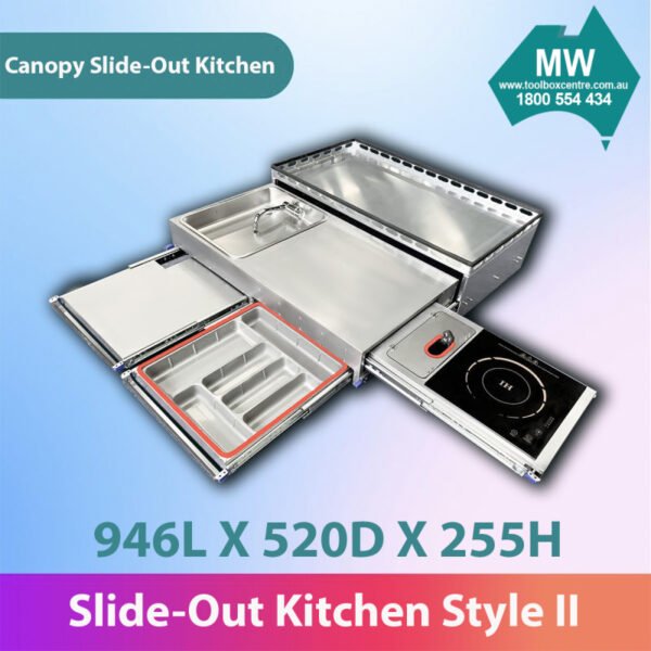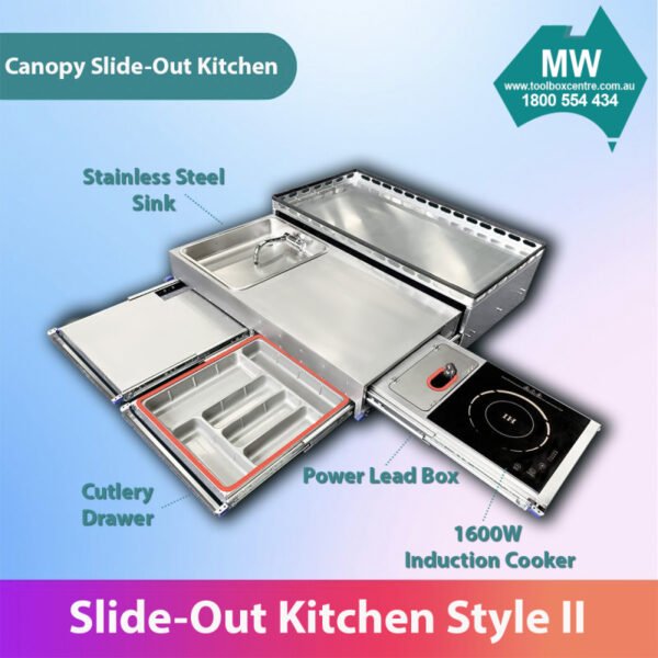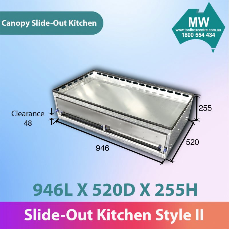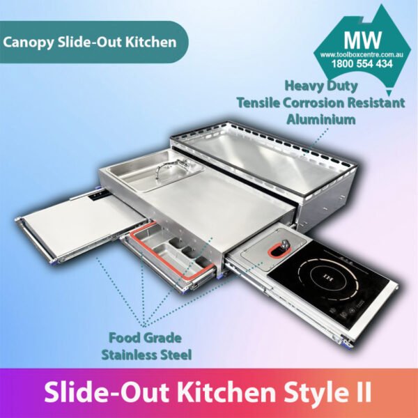 - Unlike your kitchen in the house, this MW Slide-out Kitchen style II is your most needed camping gear for your 4 wheel drive and campers. Whether it’s on your camping trips, a weekend away with the family, or just simply a quick feed before going to the worksite, the Ultimate Slide out Kitchen will pleasantly make everything so much easier and hassle free!