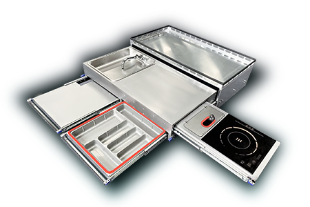- The shell is made out of 2.5mm heavy duty tensile corrosion resistant aluminium and fully TIG welded around. Fitted with 125KGs rated heavy duty telescopic lockable runners (able to lock at closed position and fully extended position) to reach the best dust and sand resistance result. The sliding bench, sink and tap, and the sliding table are all made out of food grade stainless steel.
